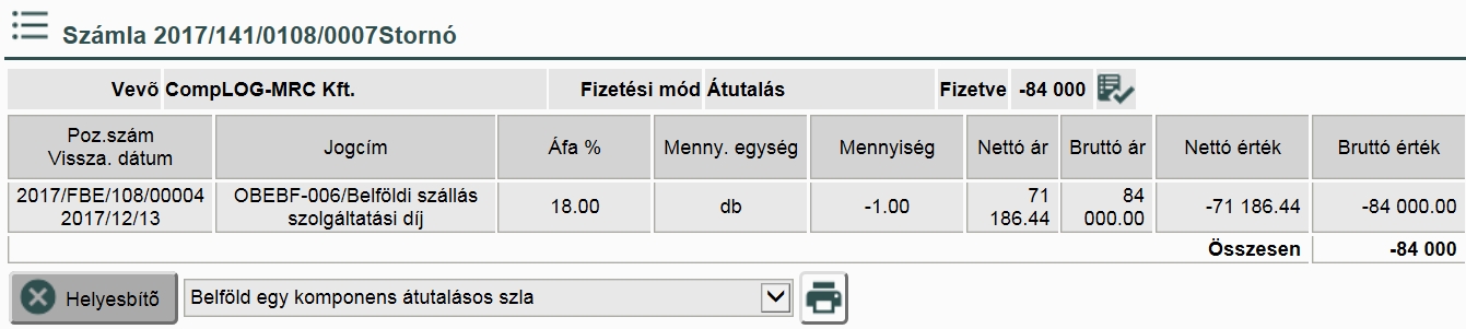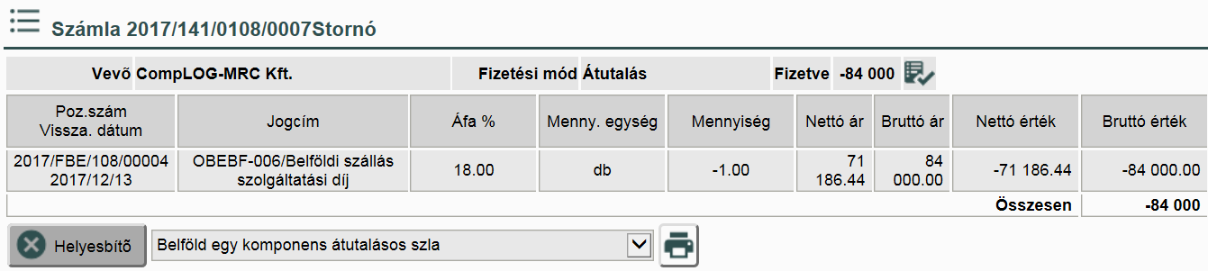 A „Helyesbítő” gombbal készíthetünk helyesbítő számlát az adott számláról.