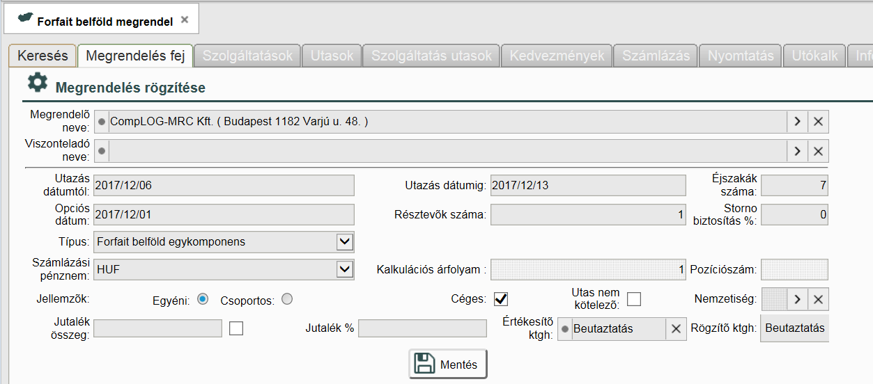 A Kezdés és Vég dátumokat automatikusan másolja a megrendelés fejből a rendszer. A szolgáltatásra érvényesen itt módosíthatóak a dátumok. Az Éjszakák számát automatikusan számolja a rendszer a kezdés és vég dátumokból.