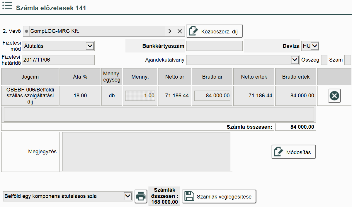 Válasszuk ki a vevőt és állítsuk be a fizetési módját, nyomjuk meg a „Módosítás” gombot, majd utána véglegesítsük a számlát a „Számlák véglegesítése” gombbal.