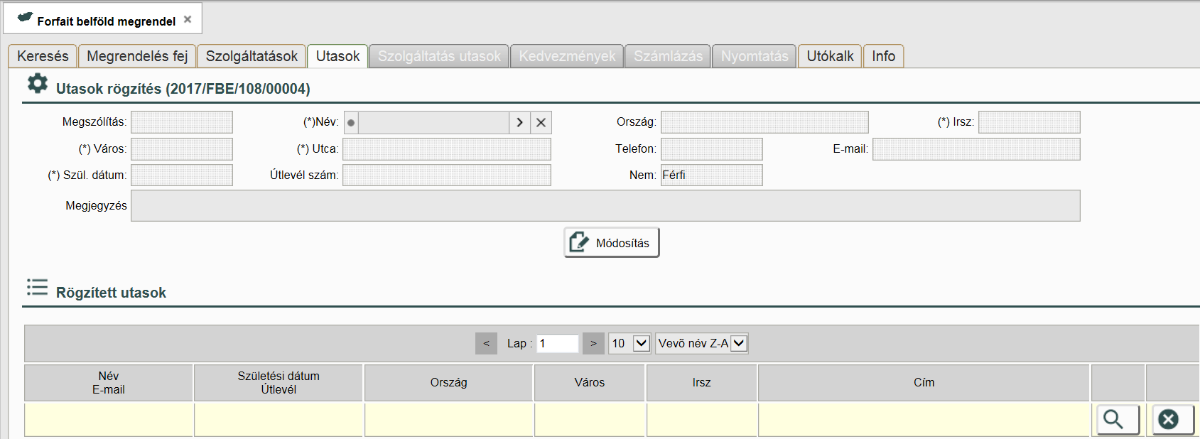 Az utasok lapon adhatjuk meg az utasaink nevét. Amennyiben a megrendelés fejen bejelöltük az utas nem kötelező négyzetet, akkor nem kell megadni az utas neveket.