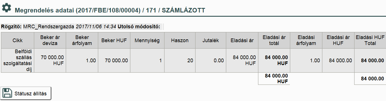 A „Státust állítás” gombbal a megrendelés státuszát tudjuk frissíteni.