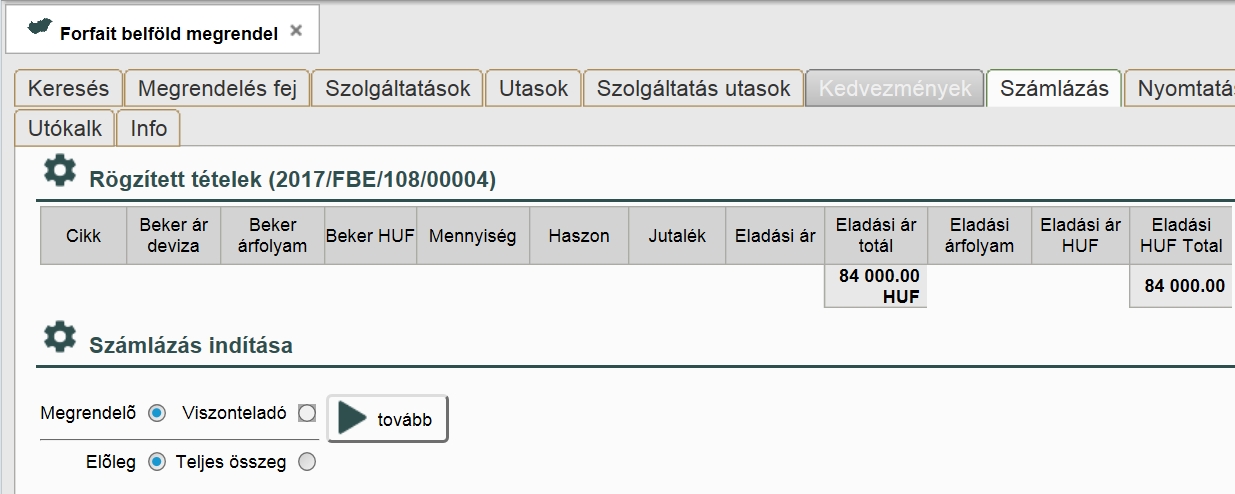 Válasszuk ki, hogy előleg vagy teljes összegű számlát szeretnénk készíteni, majd nyomjunk a „Tovább” gombra.
