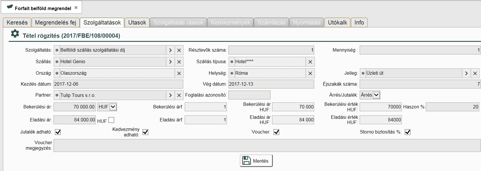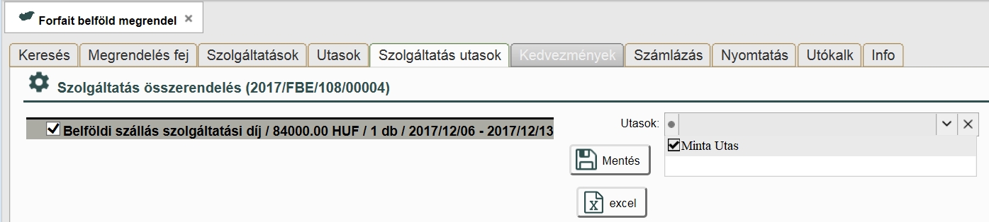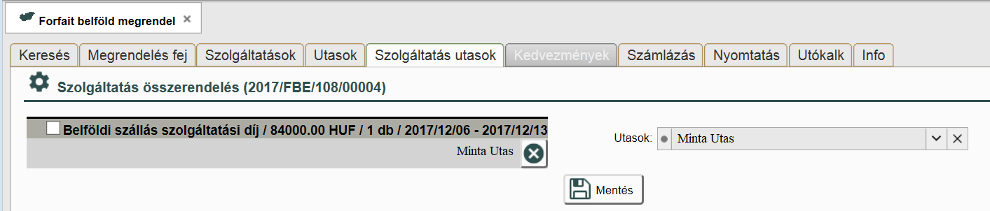 A szolgáltatás utasok lapon tudjuk összerendelni a felvitt szolgáltatásokat az egyes utasokkal. Ebben az esetben egy egyszerű külföldi szállás került értékesítésre, ami a baloldalon látszik.