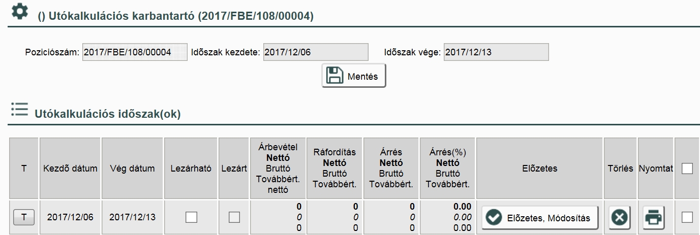 Utókalkulációs időszakok beállítását végezhetjük el az időszak kezdetének és végének megadásával, majd mentésével.