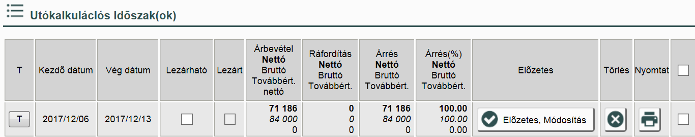 Miután elmentettük az időszakot az megjelenik az Utókalkulációs időszakok táblázatban. Az „Előzetes, Módosítás” gombbal elkészíthetjük az előzetes kalkulációt az adott időszakra.