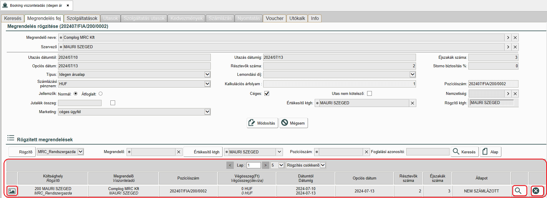 A Mentést követően a Rögzített megrendelések résznél láthatóvá válik a felvitt megrendelés.