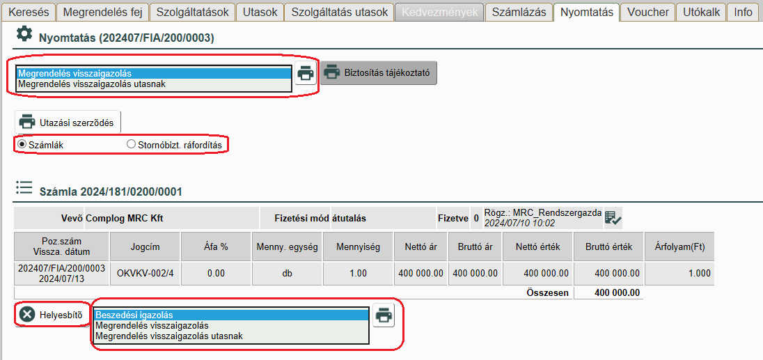 Ha megrendelőt választjuk ki, akkor beszedési igazolást állítunk ki neki.