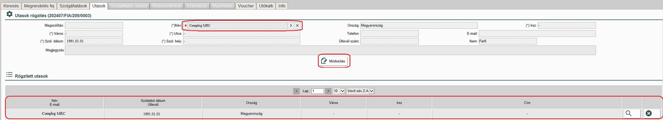 Az utasok fülön belül válasszuk be a megrendeléshez tartozó utast, ekkor az ügyfélhez kapcsolódó adatok is automatikusan kitöltésre kerülnek.