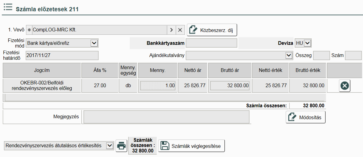 Válasszuk ki a vevőt és állítsuk be a fizetési módját, nyomjuk meg a „Módosítás” gombot, majd utána véglegesítsük a számlát a „Számlák véglegesítése” gombbal. (Átutalás esetén a díjbekérő fizetési módot válasszuk, ez egy előzetes előlegszámlát képez.)