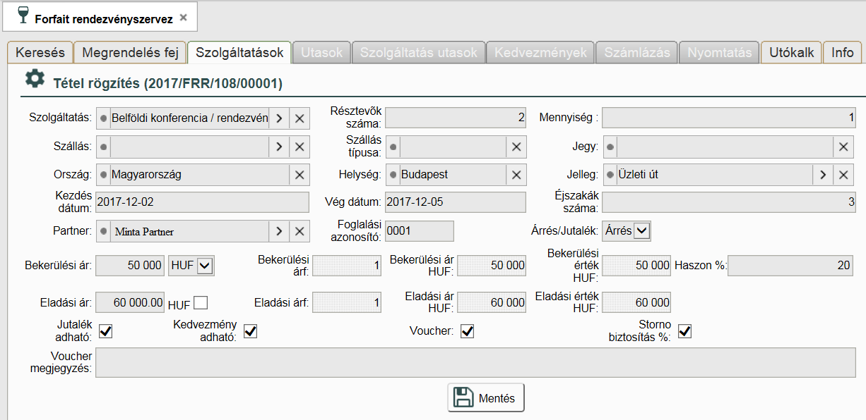 A szolgáltatás lapon adjuk meg, hogy milyen szolgáltatásokat értékesítünk a megrendelés keretében. Rendezvényszervezés esetében csomag jellegű megrendelést készítünk, több típusú szolgáltatás adható egy megrendeléshez.