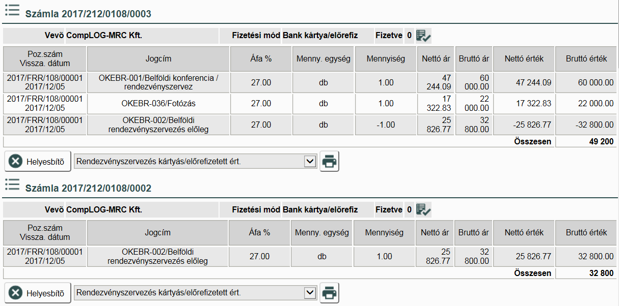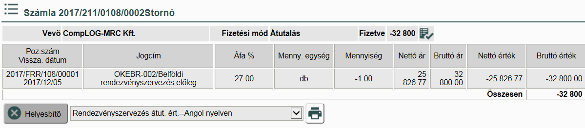 A „Helyesbítő” gombbal készíthetünk helyesbítő számlát az adott számláról. A helyesbítő számla egy mínuszos számlaként meg fog jelenni a nyomtatás lapon.