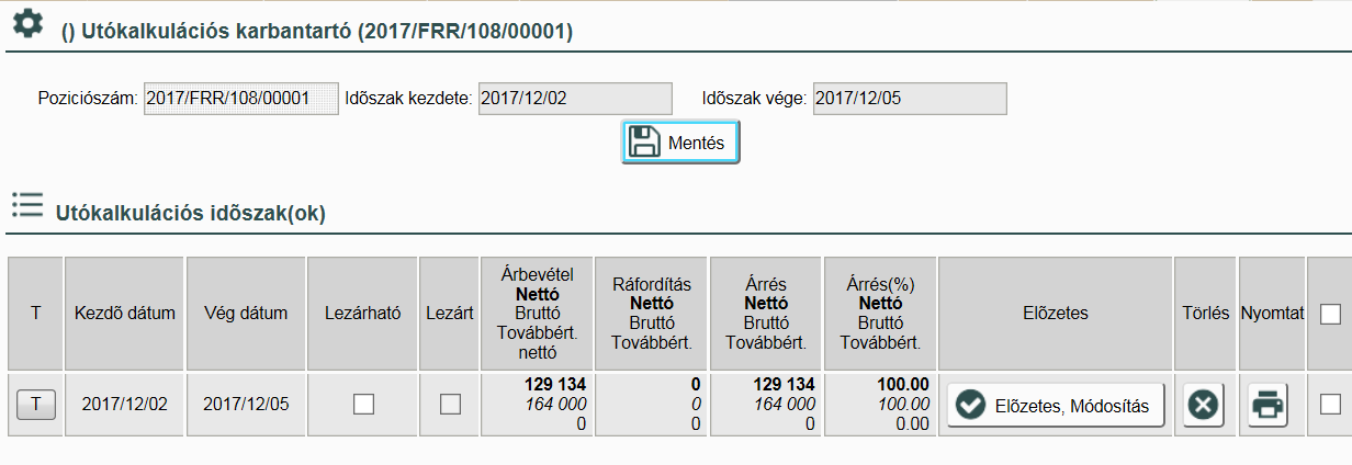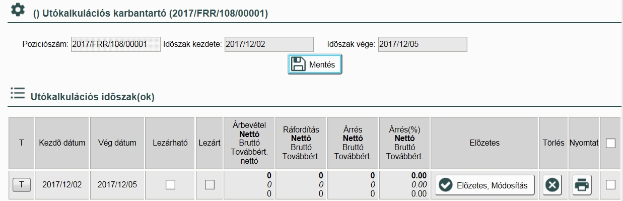 Miután elmentettük az időszakot az megjelenik az Utókalkulációs időszakok táblázatban. Az „Előzetes, Módosítás” gombbal elkészíthetjük az előzetes kalkulációt az adott időszakra.