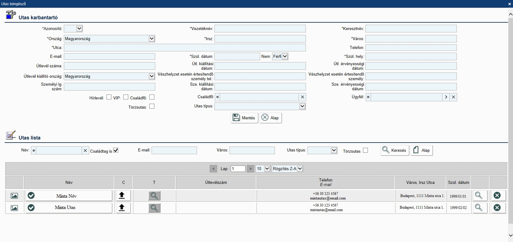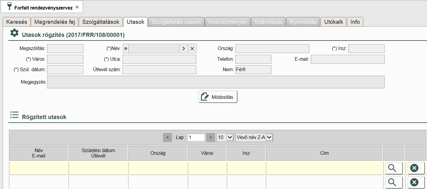 Az utasok lapon adhatjuk meg az utasaink nevét. Amennyiben a megrendelés fejen bejelöltük az utas nem kötelező négyzetet, akkor nem kell megadni az utas neveket.
