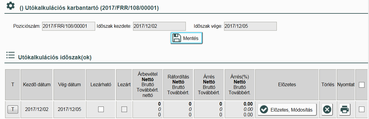 Utókalkulációs időszakok beállítását végezhetjük el az időszak kezdetének és végének megadásával, majd mentésével.
