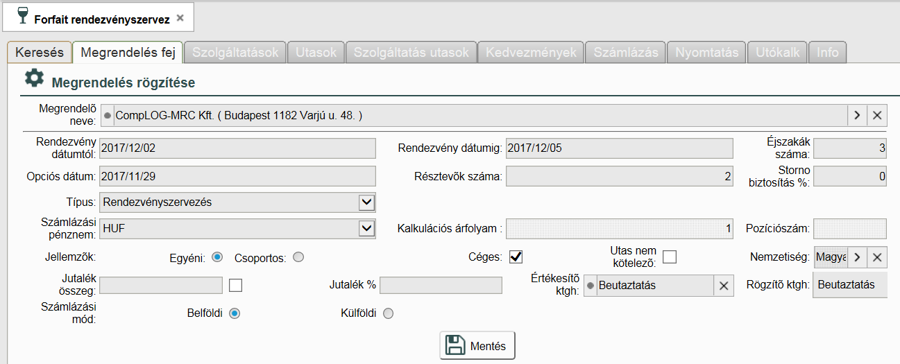 A Kezdés és Vég dátumokat automatikusan másolja a megrendelés fejből a rendszer. A szolgáltatásra érvényesen itt módosíthatóak a dátumok. Az Éjszakák számát automatikusan számolja a rendszer a kezdés és vég dátumokból.