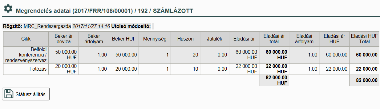 A „Státust állítás” gombbal a megrendelés státuszát tudjuk frissíteni.